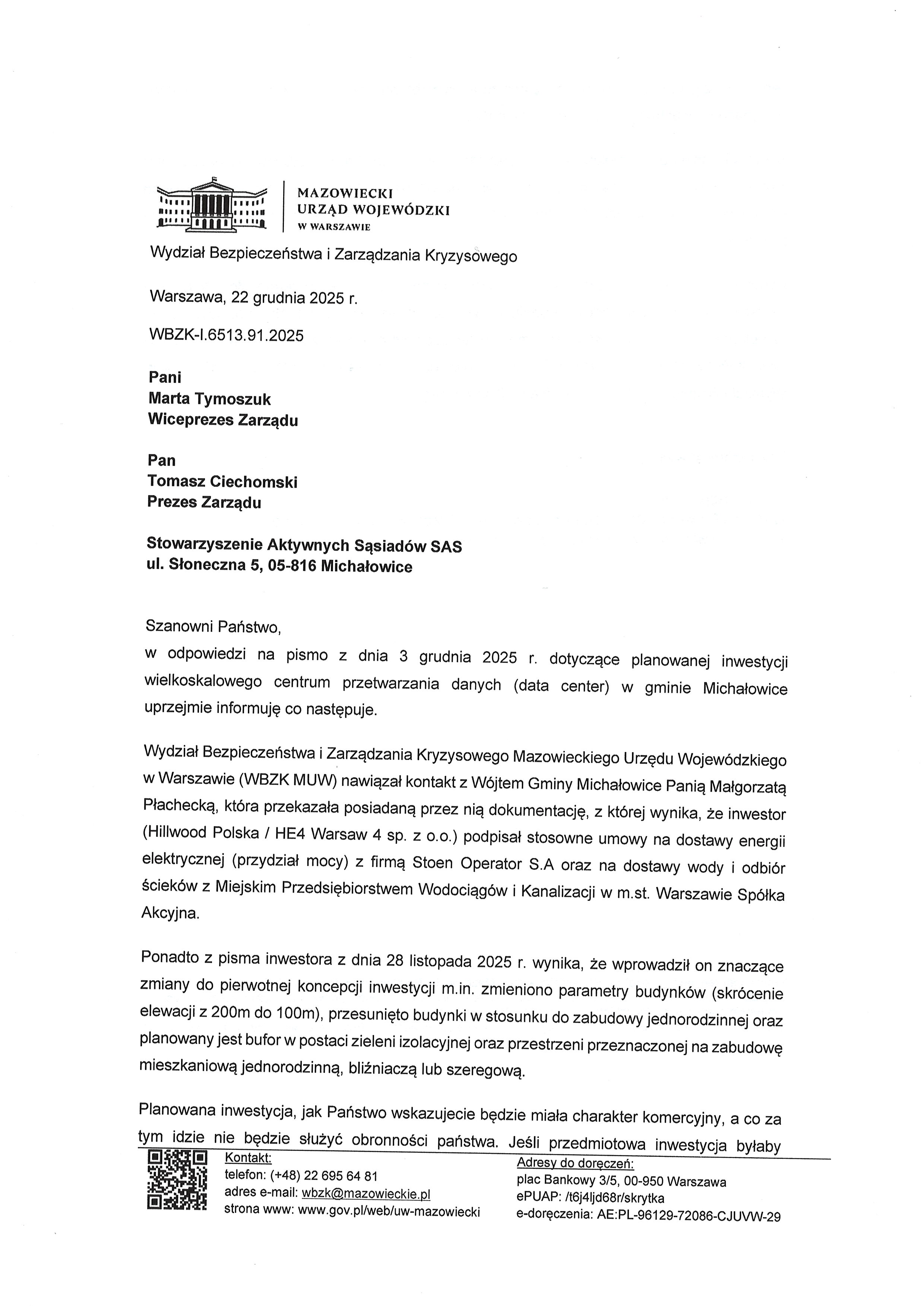 Poniżej odpowiedź Bezpieczeństwa i Zarządzania Kryzysywego na następujące pytania SAS:
