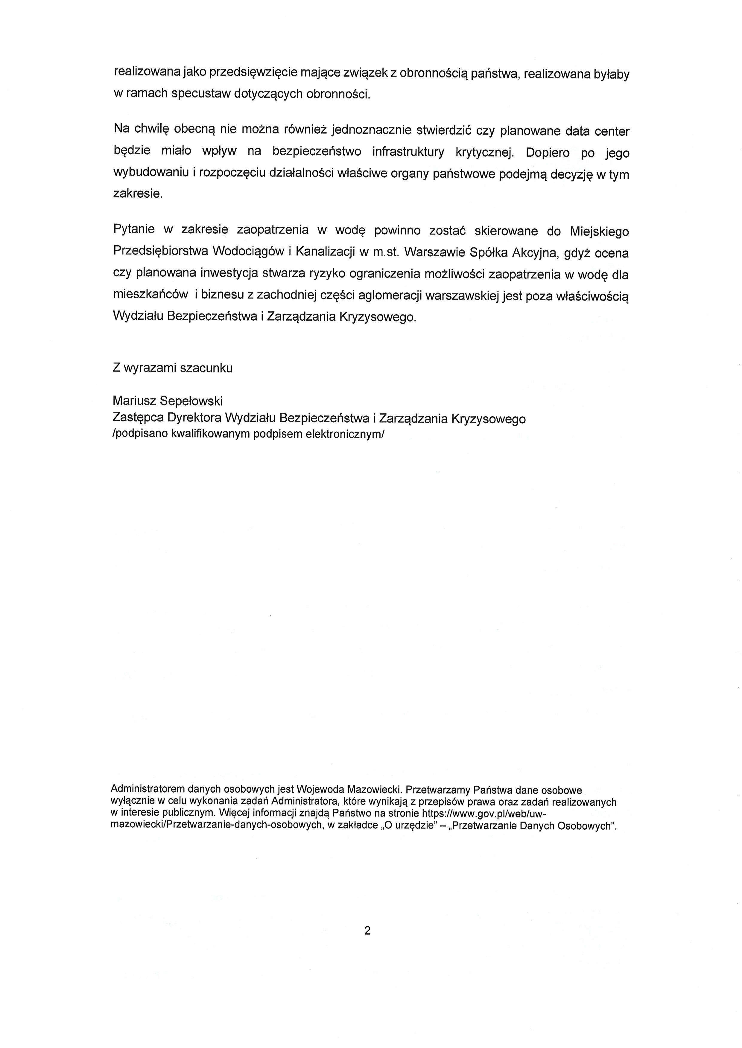 1. Czy właściwym jest dla potrzeb obronności, aby inwestycja w data center o tak dużej skali powstała w planowanej lokalizacji?